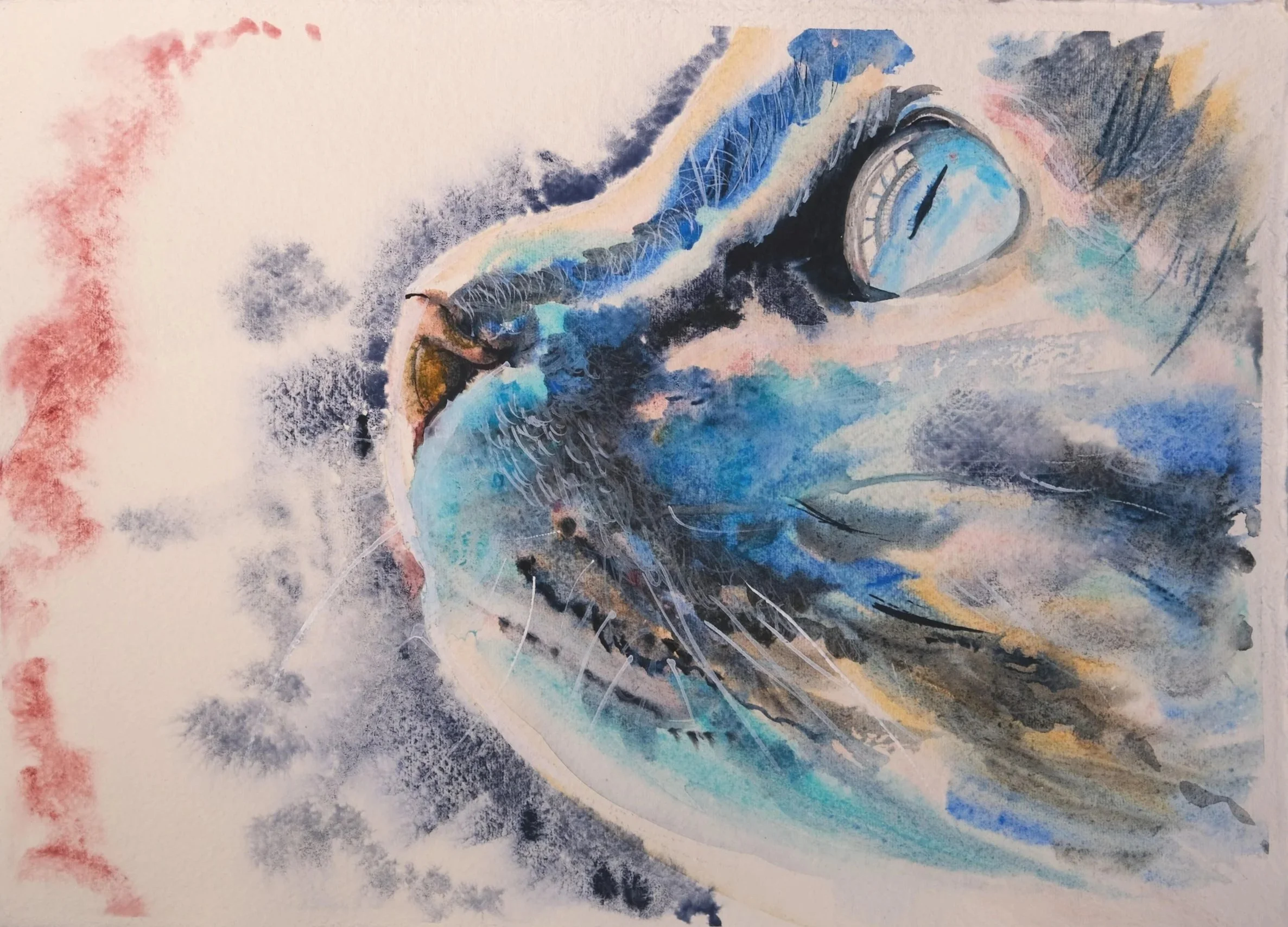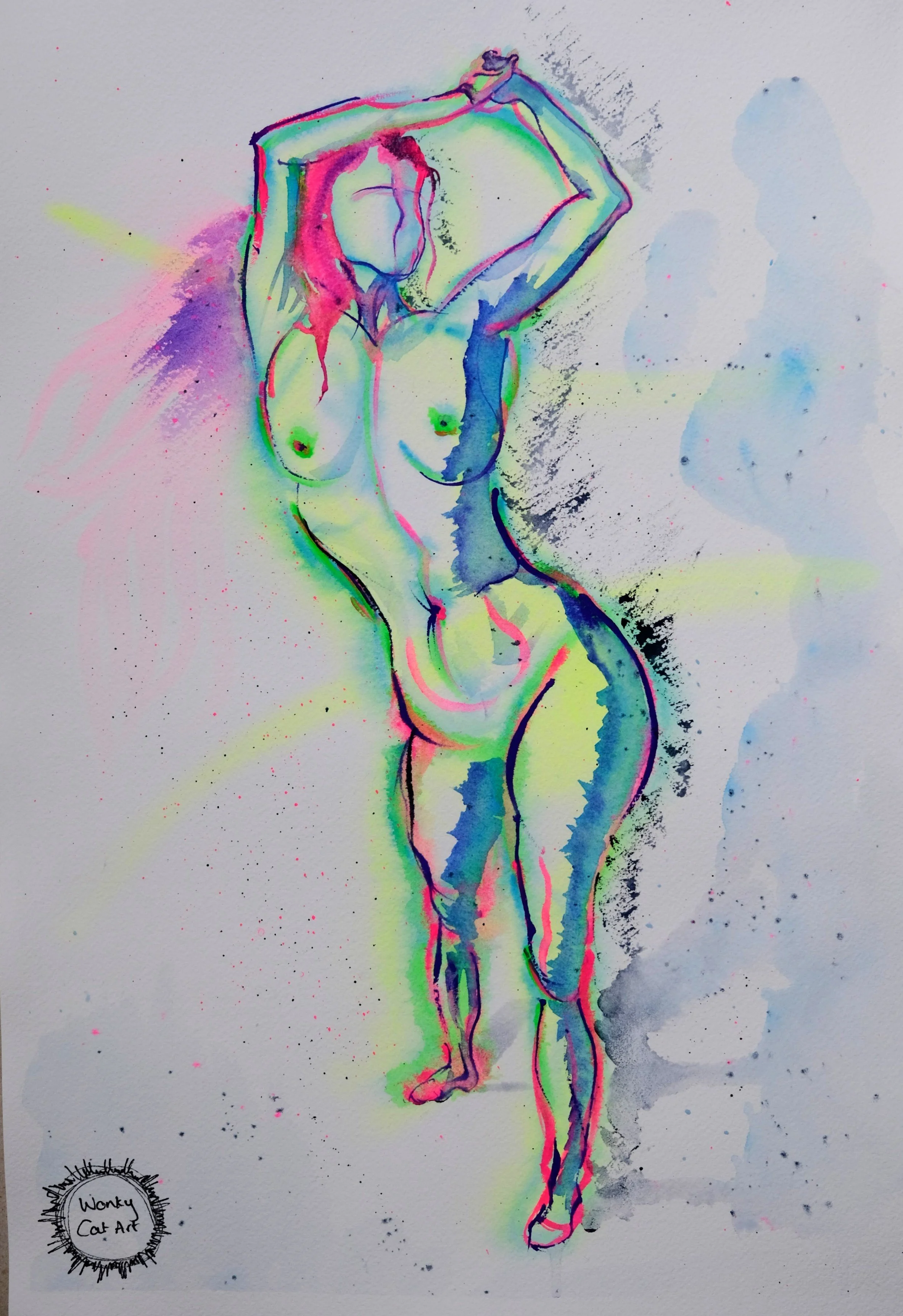 I paint primarily wet on wet in watercolour and harness the controlled chaos of water and pigment to explode the paper with colour, using splashy flicks of the brush and colluding with blooms, and backruns. I am currently exploring the possibilities of UV reactive watercolour paint. I am interested in combining this with the techniques of gesture drawing as applied to a painted surface. This process lends itself very well to capturing the transformative joy of movement.